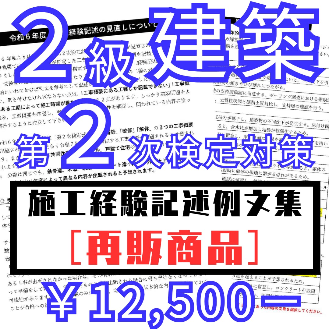 本商品は、ダウンロード商品で郵送は行いません。また添削は行いませんのでご了承ください。12級建築施工は第1次建託策模擬試験と、第2次検定試験対策の用語集のみ,記述例文集のみの単品商品と用語集+例文集のセット商品がございます。(第2次検定の模擬試験はございません)購入後のキャンセル変更はできませんので、お間違えのないようご購入下さい。